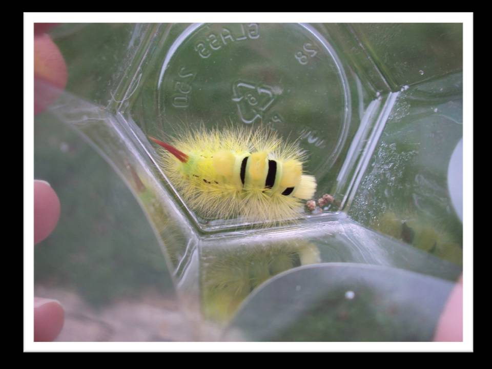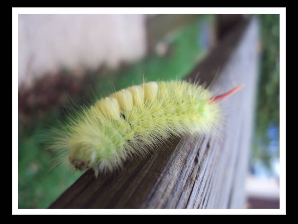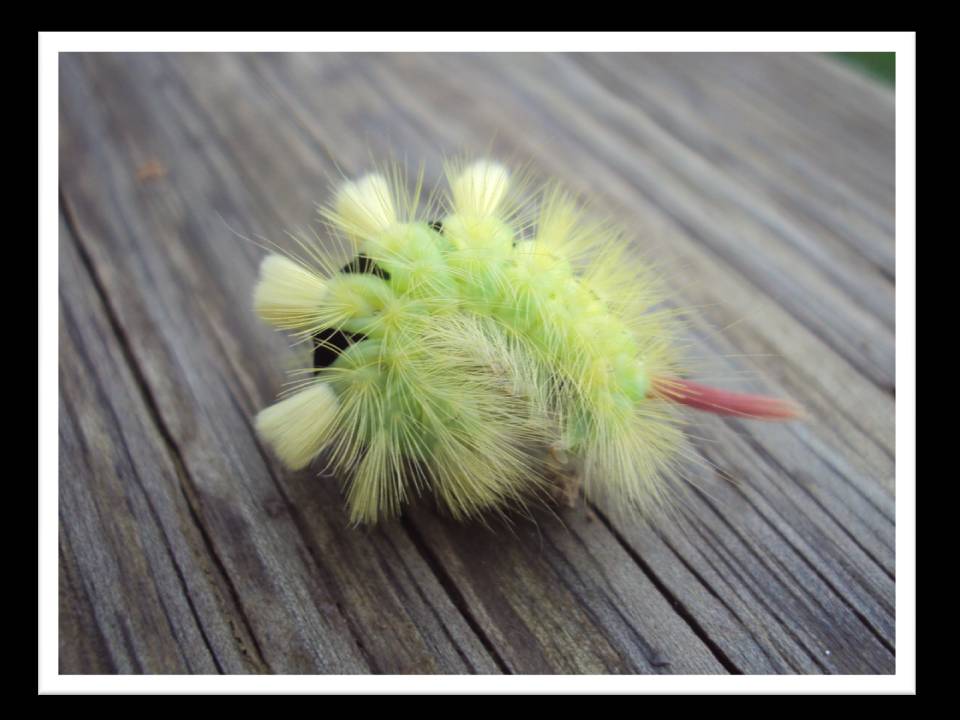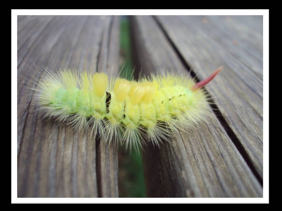 Bref, je vous présente enfin la chenille à houppe jaune. Je n'ai guère trouvé d'informations sur elle, si ce n'est qu'il vaut mieux être prudent et éviter de la toucher car en principe les chenilles poilues sont urticantes. De plus dans la nature les couleurs vives sont caractéristiques des insectes ou animaux dangereux. Exception faite de certains spécimens inoffensifs qui détournent cette particularité à leur avantage.